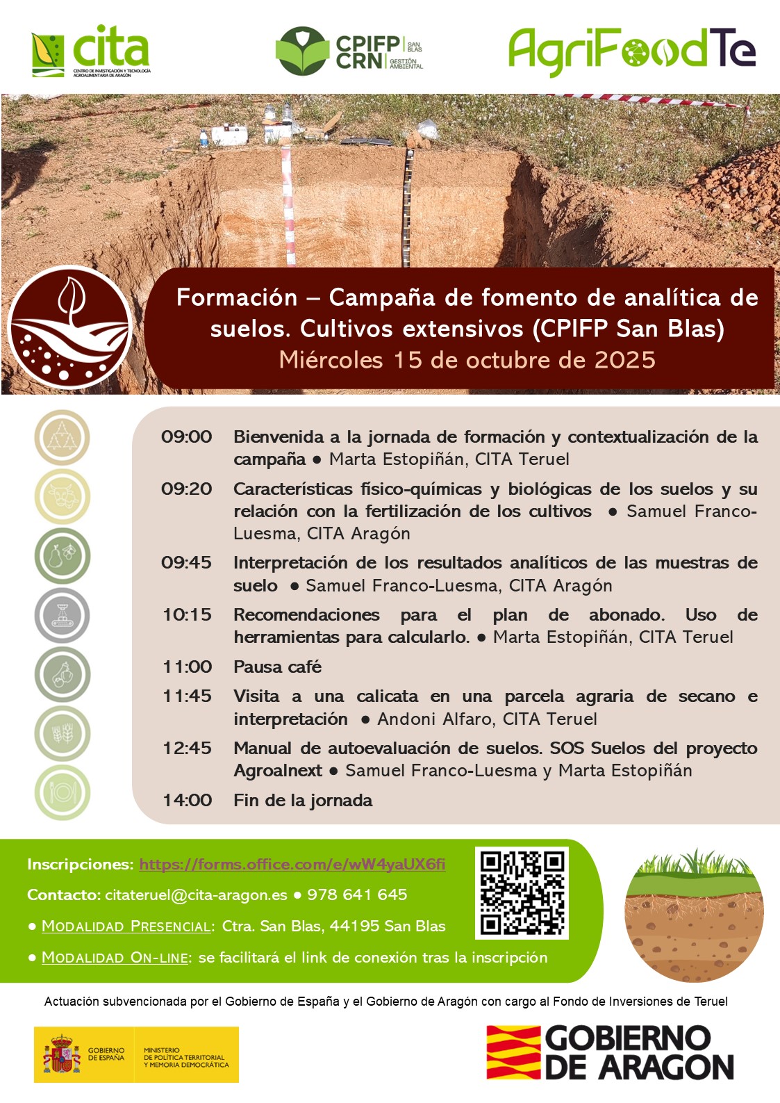 Fecha: Jueves, 15 de Octubre 2025 Lugar: CPIFP San Blas (Teruel) Ubicación en google maps Horario: 9:00 a 14:00 h Inscripciones: https://forms.office.com/e/KgvrV58KL6 Retrasmisión online a través de este enlace. Recuerda que si te has beneficiado de la Campaña de Análisis de suelos 2025 deberías de acudir presencial u online. Puedes asistir aunque no hayas participado…